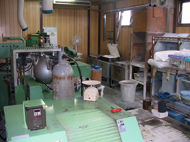 こちらが1階で、石膏を扱う作業と鋳造作業を行っています。石膏のお陰で、いくら掃除してもあまり綺麗になりません。